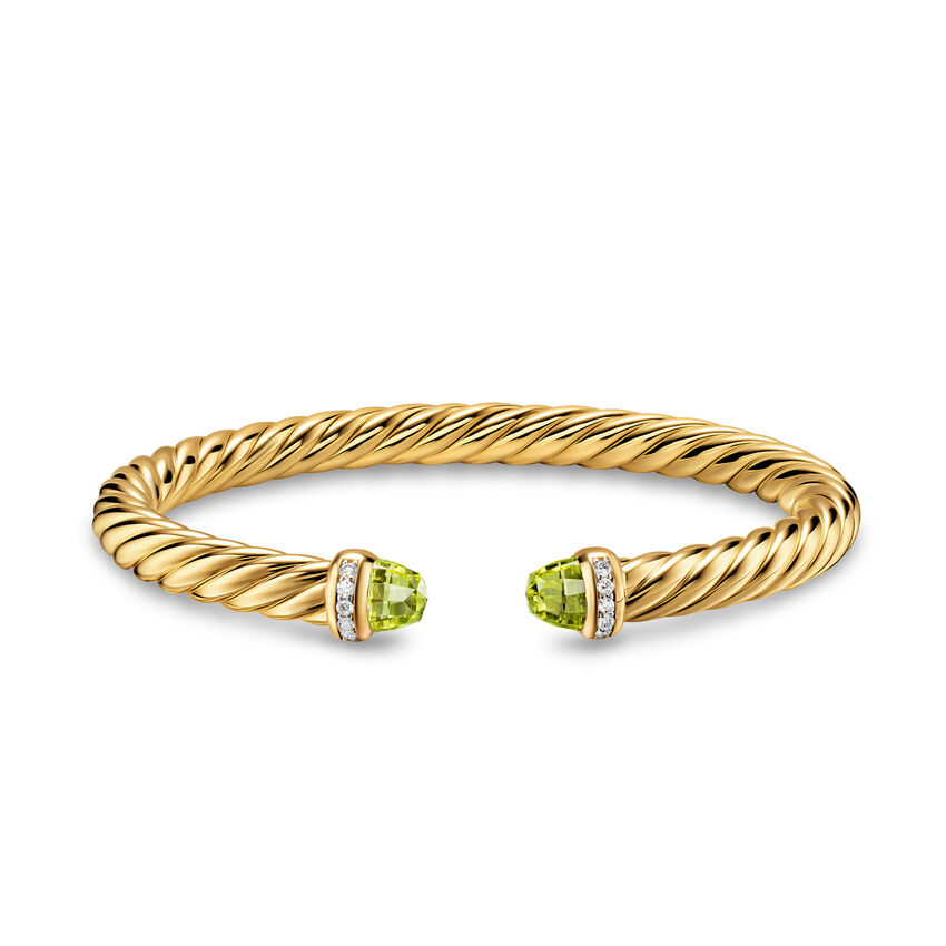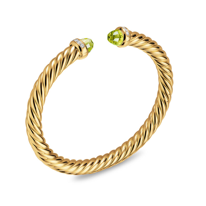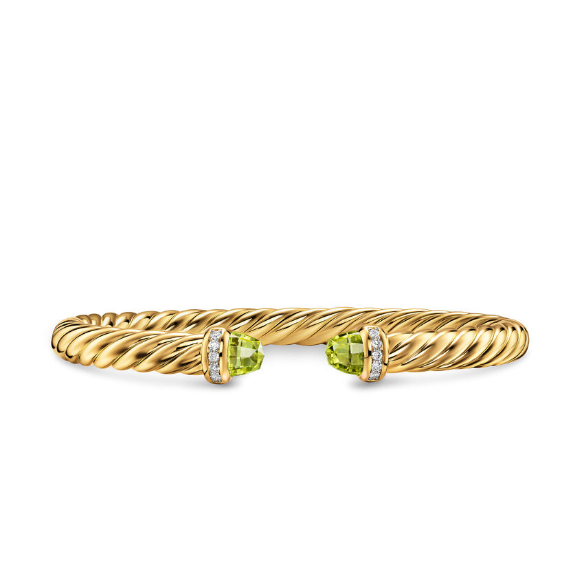 18-karat yellow gold • Peridot, Pavé set diamonds, 0.13 total carat weight • Bracelet, 6mm • Cablespira® is a patented DY construction that is highly flexible and exceptionally comfortable to wear.